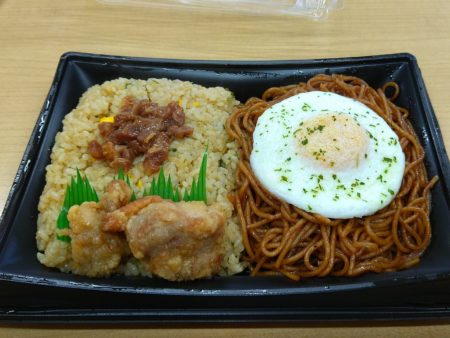 今日のお昼ごはん。ローソンの「焦がしにんにく炒飯&ソース焼そば」という贅沢メニュー。